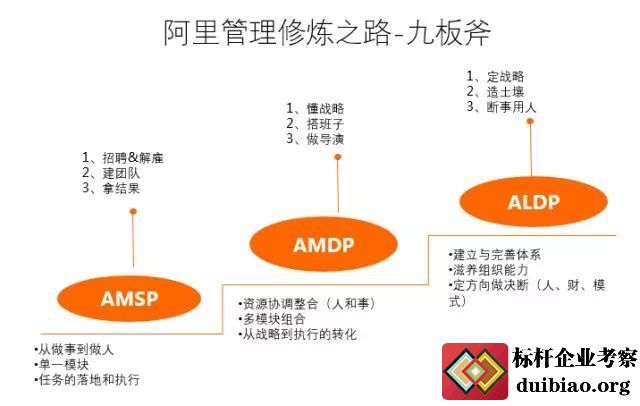 阿里巴巴的“管理三板斧”,对初级、中级和高级管理者分别做Manager Skill(经理技能)、Manager Development(管理者发展)和Leadership(领导力)三个层次的管理培训。