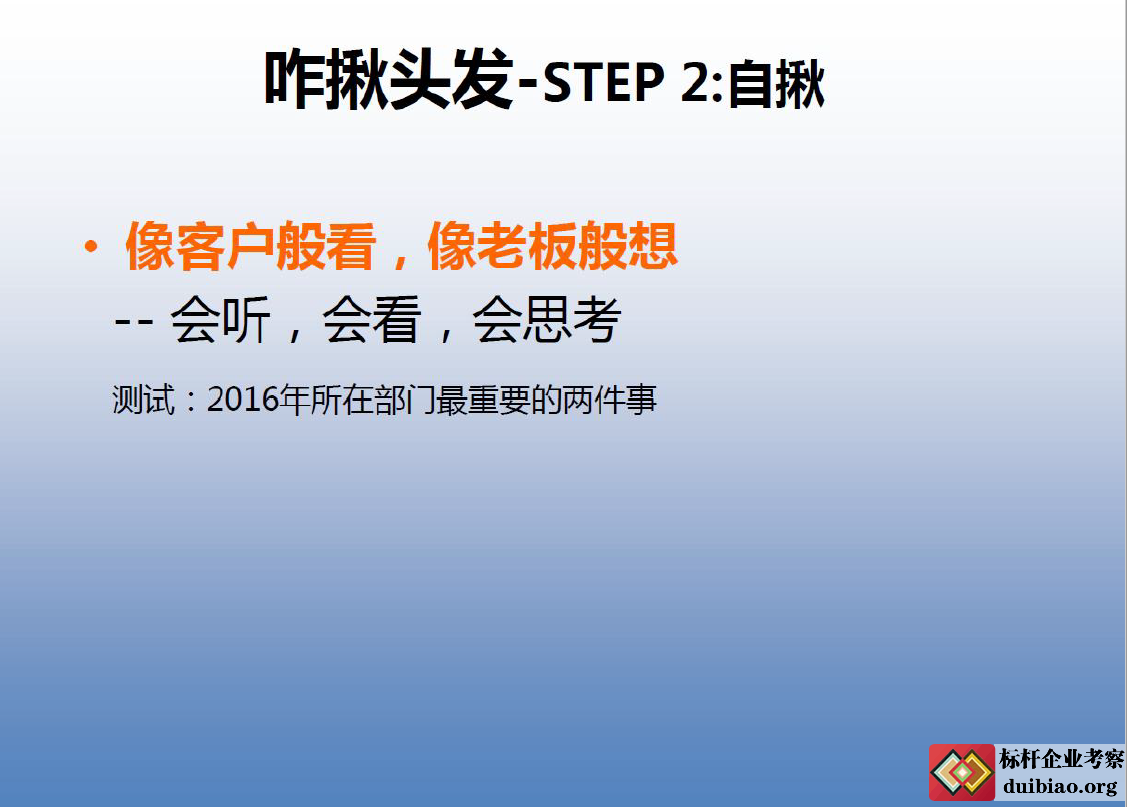 为什么要揪头发呢?这是一种行为:像客户一样想问题、像老板一样想问题;给下属腾出空间;放弃小我。这是一种态度:不是尽力而为,而是全力以赴。这更是一种状态:不断超越自我,寻求突破。